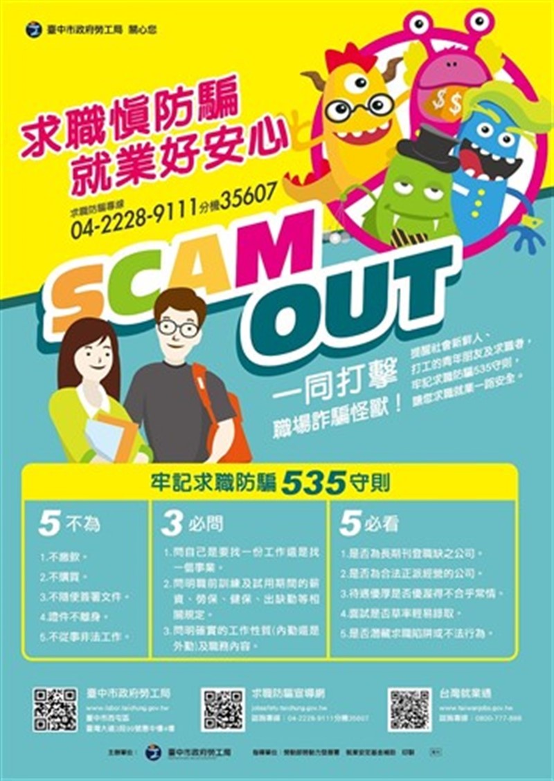勞工局呼籲,要避免誤入求職陷阱,應牢記求職防騙5不為,「不繳款、不購買、不隨便簽約、證件不離身、不從事非法工作」,讓您求職就業一路安全,求職防騙諮詢專線:04-22289111轉35607,相關資訊請洽臺中市政府勞工局「求職防騙暨保障就業隱私宣導網」 (https://www.labor.taichung.gov.tw/1261032/Lpsimplelist)。