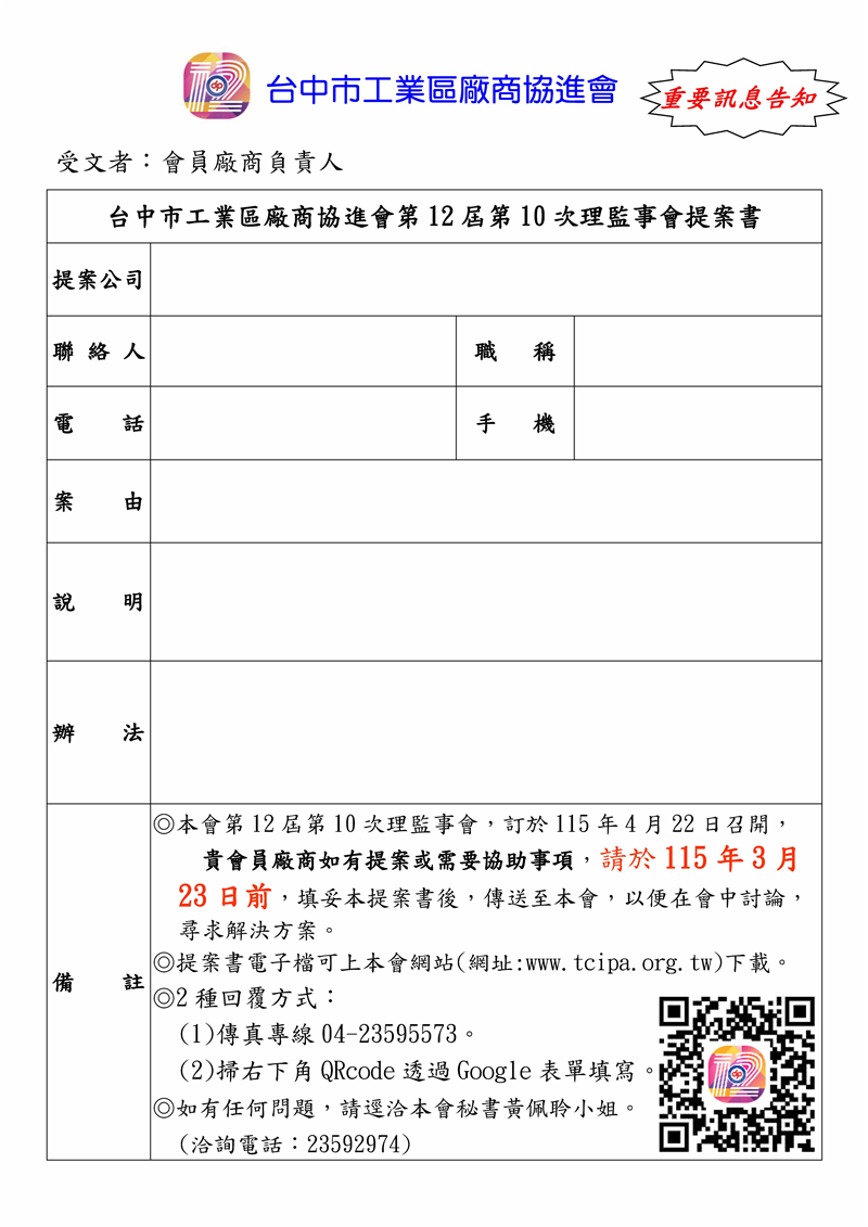 ☆本會第12屆第10次理監事會,訂於115年4月22日召開, 貴會員廠商如有提案或需要協助事項,請於115年3月23日前,填妥本提案書後,傳送至本會,以便在會中討論,尋求解決方案。
