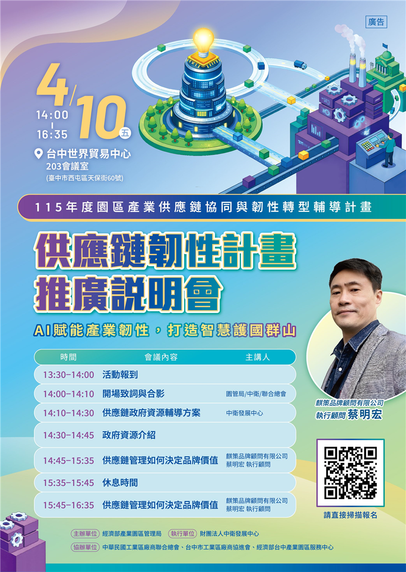 【免費活動訊息】4/10(五)「供應鏈韌性計畫推廣說明會」歡迎踴躍報名參加~